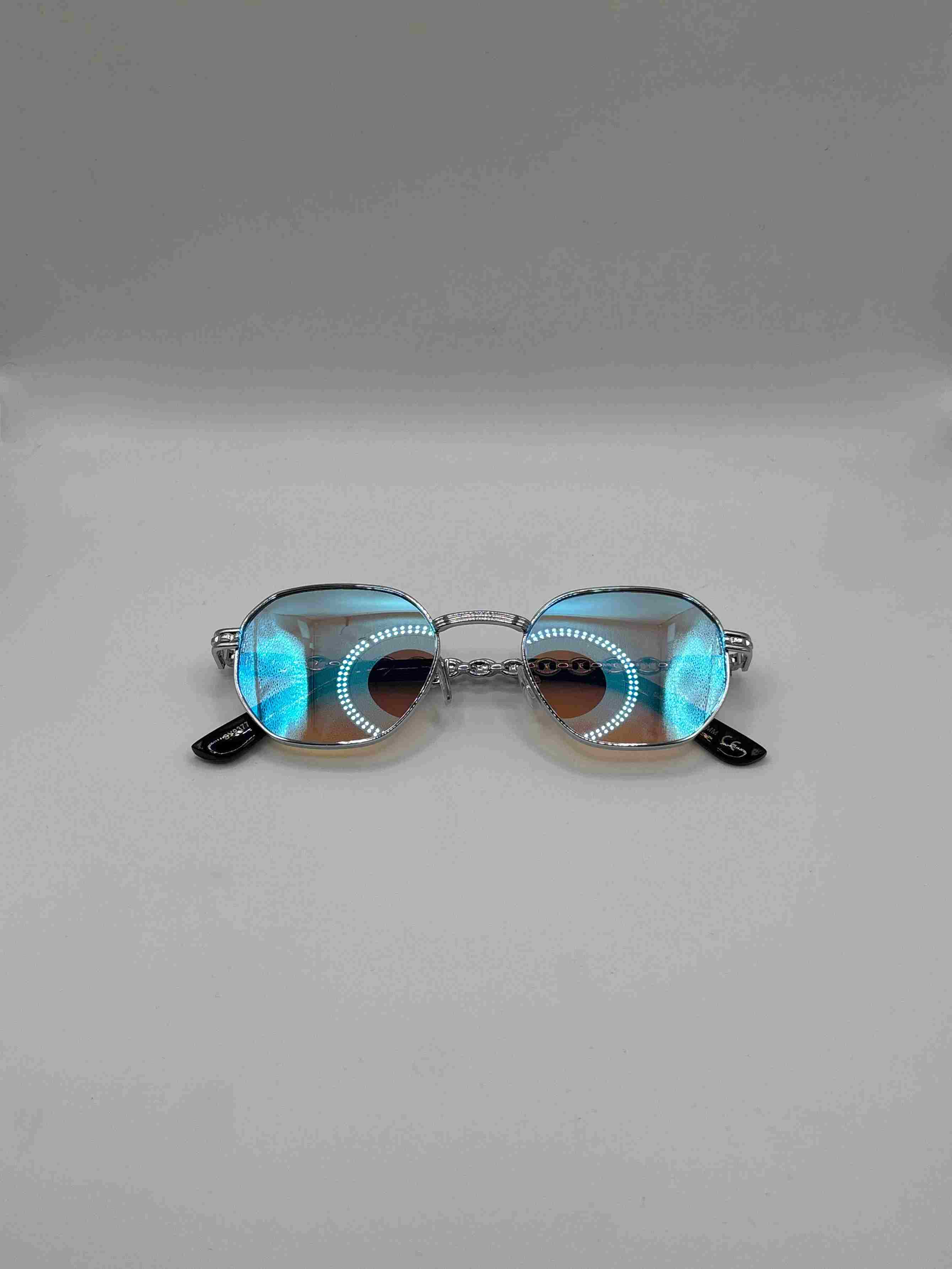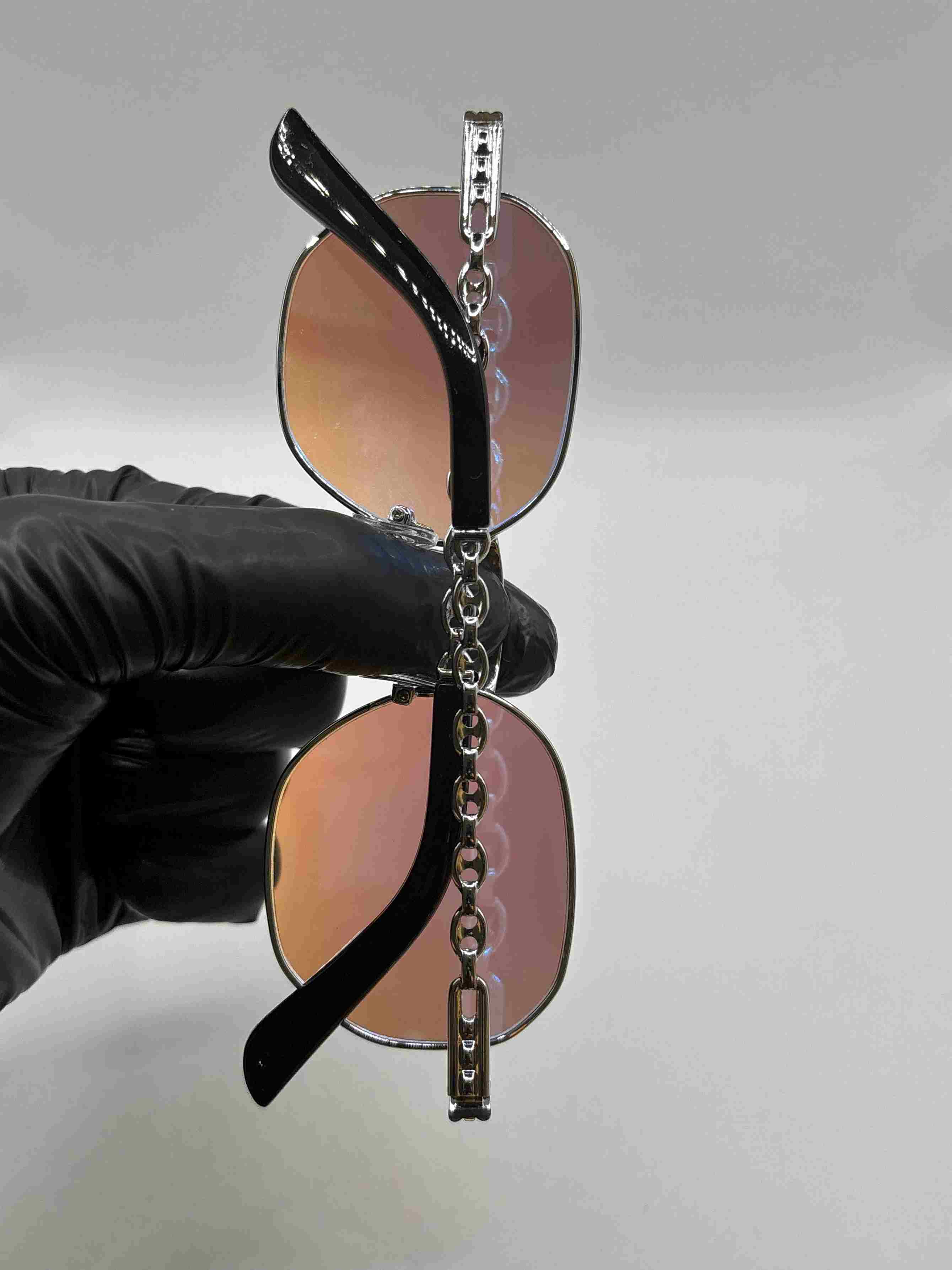 La monture est une vraie signature : une structure en métal argenté ornée de maillons “grain de café”, façon chaîne de luxe.